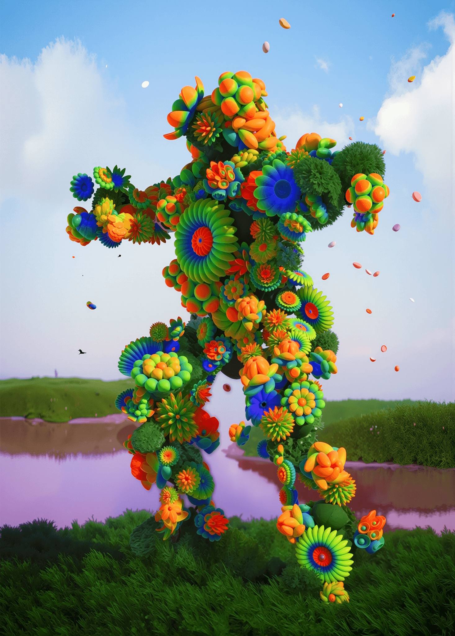 The installation comes to life at night, illuminated by addressable LEDs powered by an integrated solar panel system.